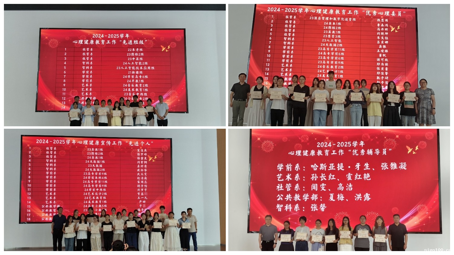 接下来各系部二级心理健康工作站的老师相继介绍了本年度所在系部的主要心理健康工作情况。 各二级心理健康工作站紧密围绕专业特点与学生心理需求,策划并实施了形式丰富、内容精准的心理健康教育活动。如:学前教育系打造了富有特色的“团体心理活动”,公共教学部推出了“阳光户外拓展”,艺术系的“读书沙龙”,社管系开展了“幸福打卡计划”,智科系则创新性地推出“快乐编码”。在积极探索创新模式的实践中,成功凝练出一批彰显系部特色的品牌项目。颁奖大会上与会领导为优秀辅导员、优秀班级、优秀心理委员和优秀工作者等颁奖。